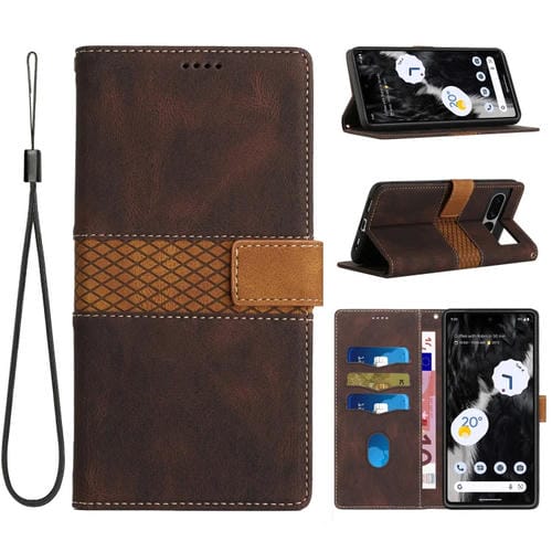 Funda de Cuero con Costuras en Cuadrícula para Google Pixel 7 Pro con Cordón (Marrón)