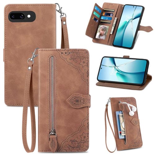 Funda de Cuero con Cremallera y Flores en Relieve para Google Pixel 9A (Marrón)