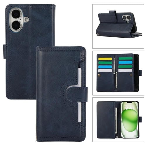 Funda de Cuero para iPhone 16 Plus con Ranura para Tarjeta y Pulsera (Azul)