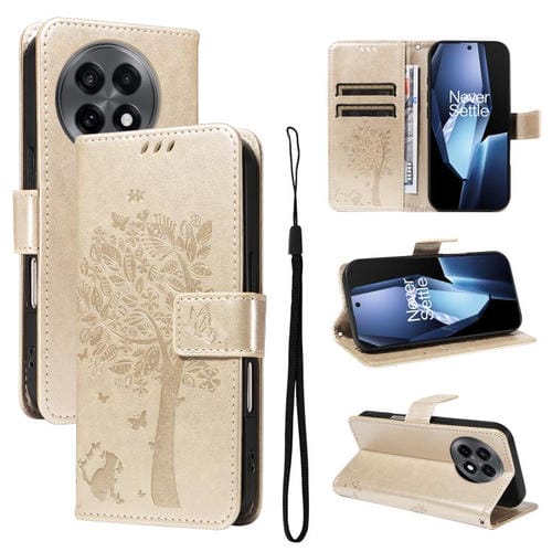 Funda de Cuero con Tapa para OnePlus 13R Global con Patrón En Relieve Árbol y Gato (Dorada)