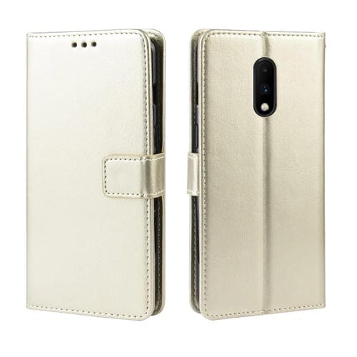 Funda de Cuero OnePlus 7 con Tapa Horizontal Retro, Soporte, Ranuras y Marco de Fotos (Dorado)