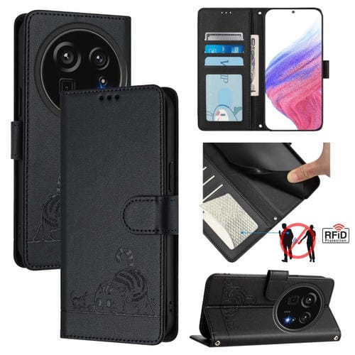Funda de Cuero Rfid para Sharp Aquos R9 Pro con Estampado de Rata y Gato en Relieve y Cordón (Negro)