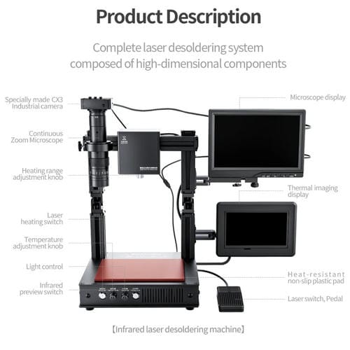 - Pantalla térmica de 7 pulgadas, Potencia láser de 55W, voltaje de entrada 110-220V, control automático de temperatura en tiempo real, rango de calentamiento 100 ~ 450 °C, tamaño desplegado 58,5 x 27,5 x 48,5 cm