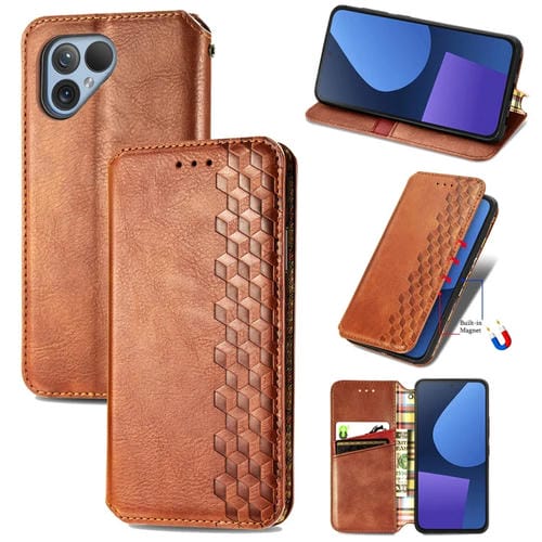 Funda para Fairphone 5 Cubic Grid de Cuero Magnético Prensado (Marrón)