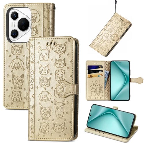 Funda de Cuero para Huawei Pura 70 Pro con Relieve Perros y Gatos (Dorado)