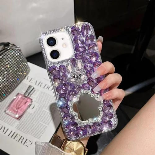Funda para teléfono iPhone 12 Diamond Mirror Bunny hecha a mano para PC (Espejo de Flor Púrpura)