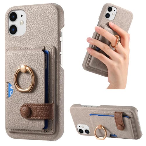 Funda para Teléfono iPhone 12 Parte Posterior Tarjeta Anillo Borde Aceite Cuero Litchi (Caqui)