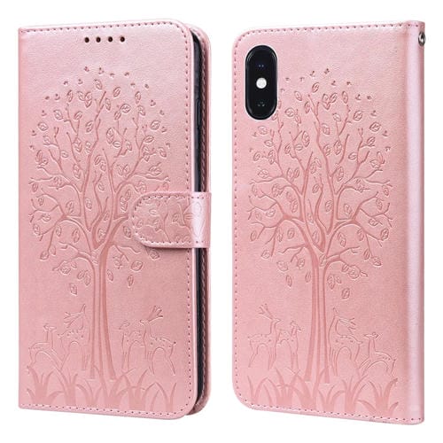 Funda para iPhone Xr Cuero con Tapa Horizontal Patrón de Árbol y Ciervo (Rosa)