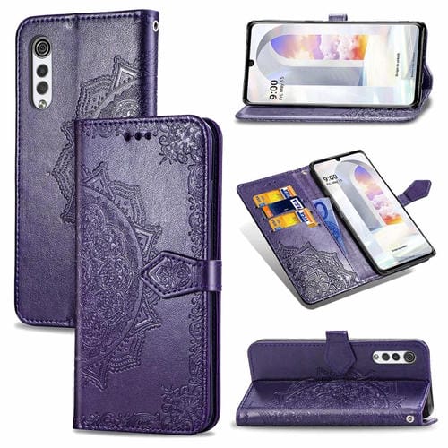 Funda de Cuero LG Velvet 2 Pro Mandala Estampado en Relieve con Soporte, Ranuras y Cordón (Púrpura)