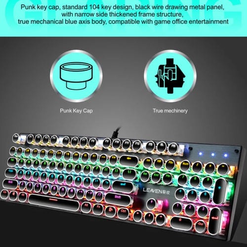 El Teclado mecánico de Metal con Cable USB de 1.5 metros y 104 teclas con eje verde ofrece una experiencia de escritura precisa y robusta, ideal para usuarios que buscan un rendimiento fiable tanto en Juegos como en tareas informáticas. Este modelo cuenta con iluminación RGB dinámica y brillante, que permite una visualización clara en ambientes con poca luz. Su diseño ergonómico y Teclado flotante de seis niveles facilita la adaptación natural de los dedos, reduciendo la fatiga durante largas sesiones de uso. La doble inyección en las teclas garantiza resistencia al desgaste y una transmisión de luz uniforme. Además, su estructura metálica robusta y el diseño a prueba de salpicaduras aportan durabilidad y seguridad en diferentes entornos de trabajo.