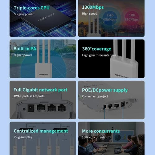 - 1x Amplificador de Señal Inalámbrico Gigabit Comfast CF-EW85 1300 Mbps 2,4G/5,8G Compatible CC/PoE Enchufe Estadounidense