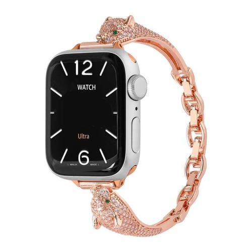 Correa de reloj con cabeza de leopardo y circonitas incrustadas de cobre para Apple Watch de 42 mm, 41 mm, 40 mm y 38 mm (oro rosa)