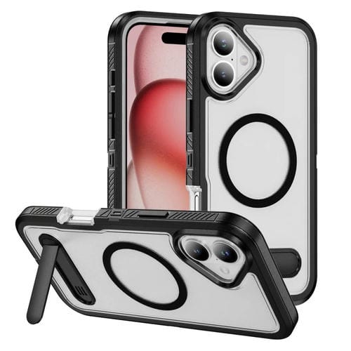 Estuche híbrido TPU y PC con soporte Magsafe para iPhone 16 (Negro Transparente)