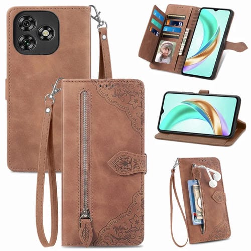 Funda de Cuero con Cremallera y Flores en Relieve para Oukitel C53 (Marrón)