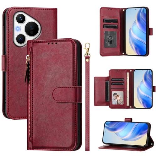 Funda de Cuero con Cremallera y Ranuras para Tarjetas para Huawei Pura 70 (Rojo Oscuro)