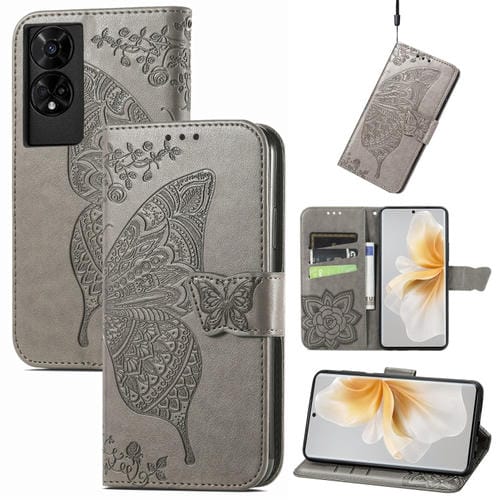 Funda de Cuero para TCL 50 5G con Relieve Mariposa y Flor (Gris)