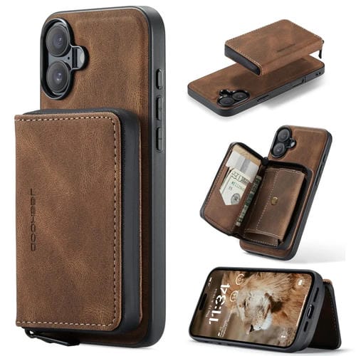 Funda de Cuero Jeehood J02 para iPhone 16 con Tapa Horizontal y Cremallera Magnética (Marrón)