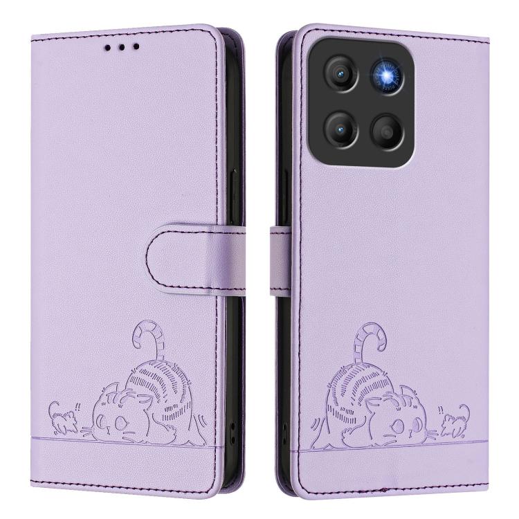 Funda de Cuero Rfid Motorola Moto G15 con Estampado de Rata y Gato En Relieve y Cordón (Morado)