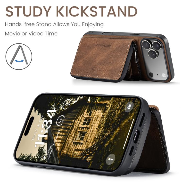 Funda de piel con cremallera magnética horizontal tipo libro JEEHOOD J02 para iPhone 17 Pro (marrón)
