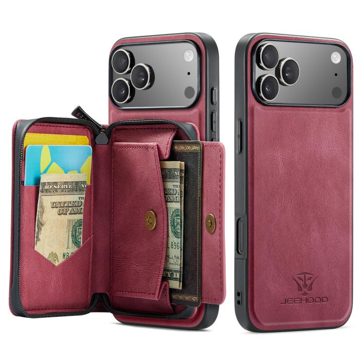 Funda de piel con cremallera magnética JEEHOOD J02 tipo libro horizontal para iPhone 17 Pro Max (Roja)