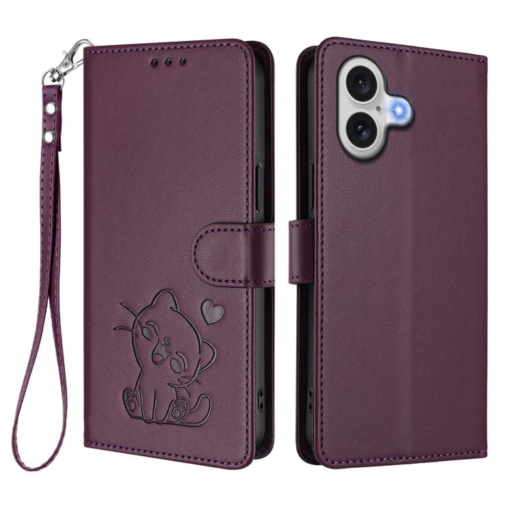 Funda de piel con diseño de gato y corazón en relieve para iPhone 17 con correa de mano (morado oscuro)