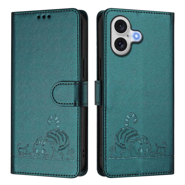 Funda de piel RFID con estampado de gato y rata para iPhone 17 con cordón (verde pavo real)