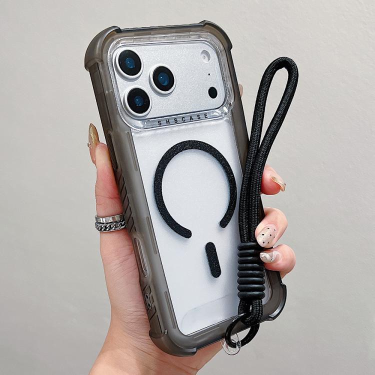 Funda híbrida de TPU mate transparente 3 en 1 MagSafe para iPhone 17 Pro con correa de muñeca (negra)