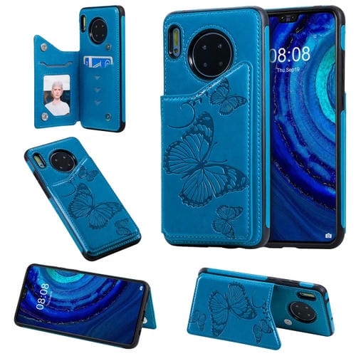 Funda Protectora Huawei Mate30 Estampado Mariposa con Soporte, Ranuras y Marco de Fotos (Azul)