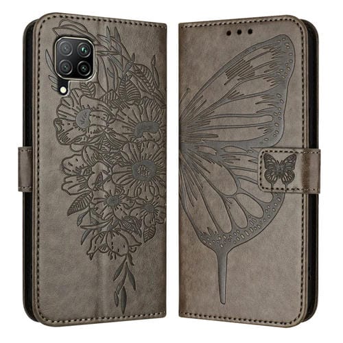 Funda de Cuero para Huawei P40 Lite 4G y Nova 6 Se con Mariposa en Relieve (Gris)