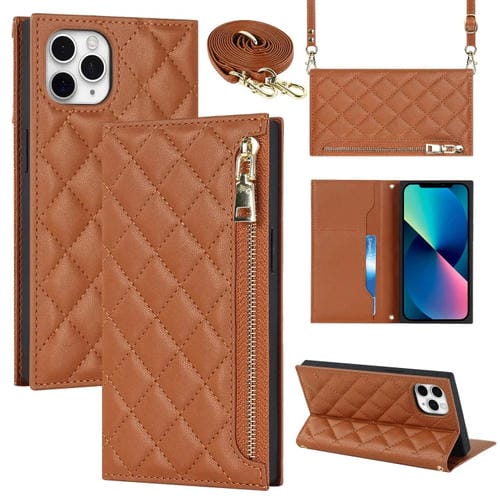 Funda de Cuero para iPhone 11 Pro Max Grid Texture con Lanyard y Cremallera (Marrón)