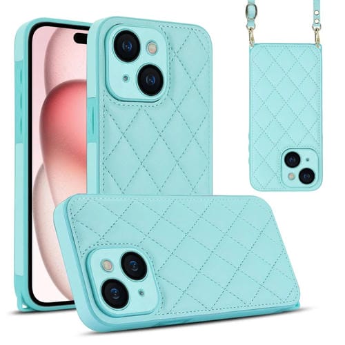 Estuche para Teléfono iPhone 15 Plus Textura Rómbica y Cordón Doble (Verde)
