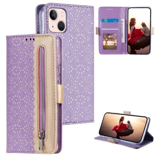 Funda de Cuero para iPhone 15 Plus con Cremallera y Doble Botón Patrón de Encaje y Cordón (Púrpura)