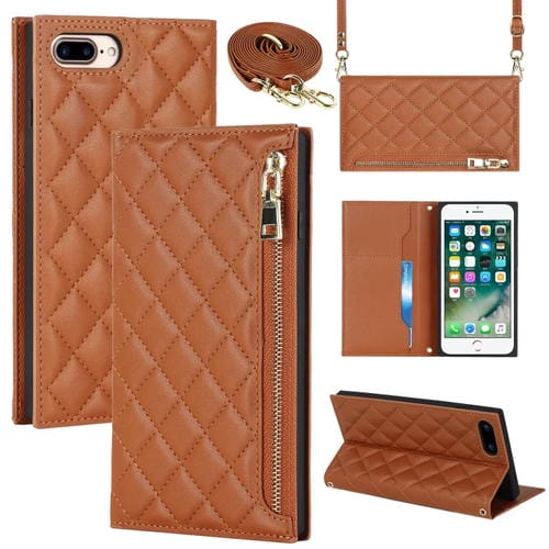 Funda de Cuero con Cremallera para iPhone 8 Plus y 7 Plus Grid Texture Lanyard (Marrón)