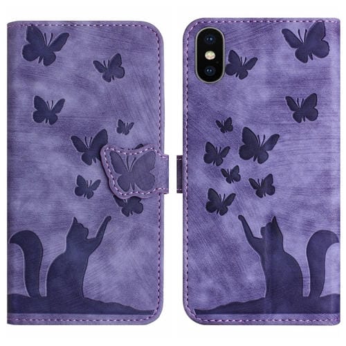 For iPhone X/XS Butterfly Cat Pattern Flip Leather Case (Purple)