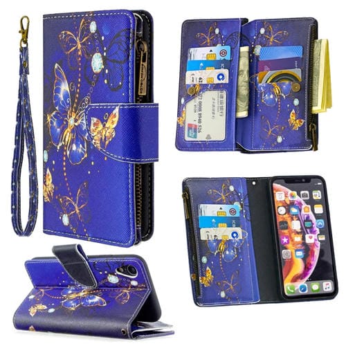 Funda de Cuero para iPhone Xr con Patrón de Dibujo a Color, Cremallera, Tapa Horizontal, Soporte, Ranuras para Tarjetas y Billetera (Mariposa Púrpura)