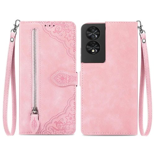 Funda para TCL 40 Nxtpaper 4G de Cuero con Cremallera y Flores en Relieve (Rosa)