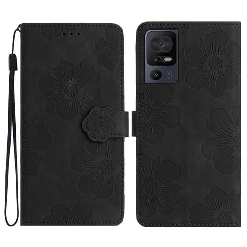 Funda de Cuero para TCL 40 Se con Estampado de Flores en Relieve (Negro)