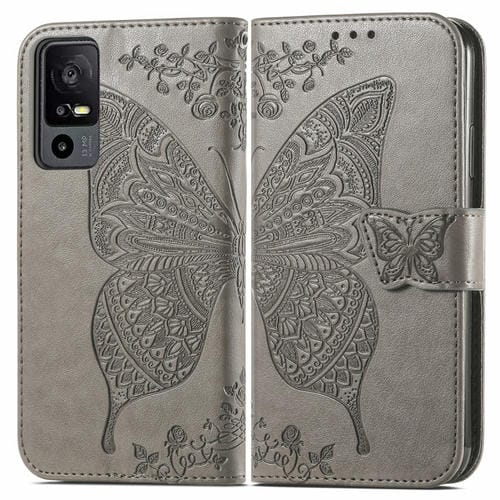 Funda de Cuero para TCL 40 Xe Butterfly Love Flower en Relieve (Gris)