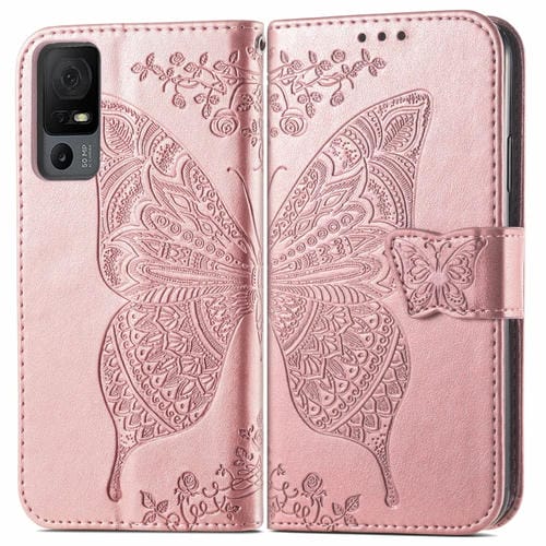 Funda para TCL 40 XL de Cuero con Relieve de Flor de Amor y Mariposa (Oro Rosa)