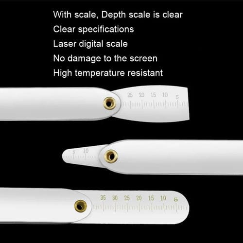 • Diseño 2 en 1 con hoja de corte y rodillo para separación de Pantalla, escala Digital láser para medición precisa, peso aproximado de 46 g, longitud de 14,9 cm, resistencia a altas temperaturas, borde pulido para evitar daños en la mano y en la Pantalla, cabezas intercambiables con cuatro formas diferentes