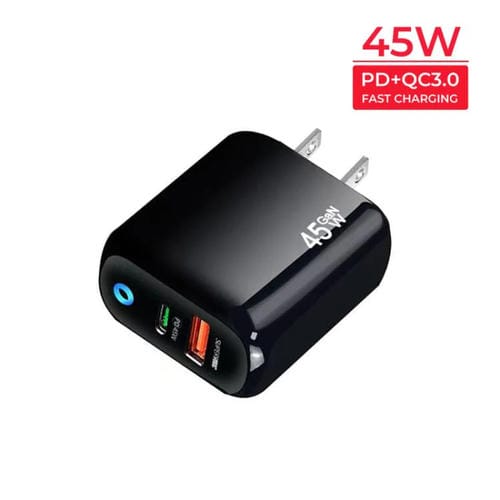 Cargador TE-PD45 GaN 45 W PD3.0/Tipo C + USB 3.0 con cable de datos tipo C a tipo C, enchufe estadounidense (negro)