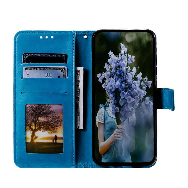 Funda de Cuero con Relieve de Flores y Tótem para Xiaomi Redmi Note 14 5G con Cordón (Azul)