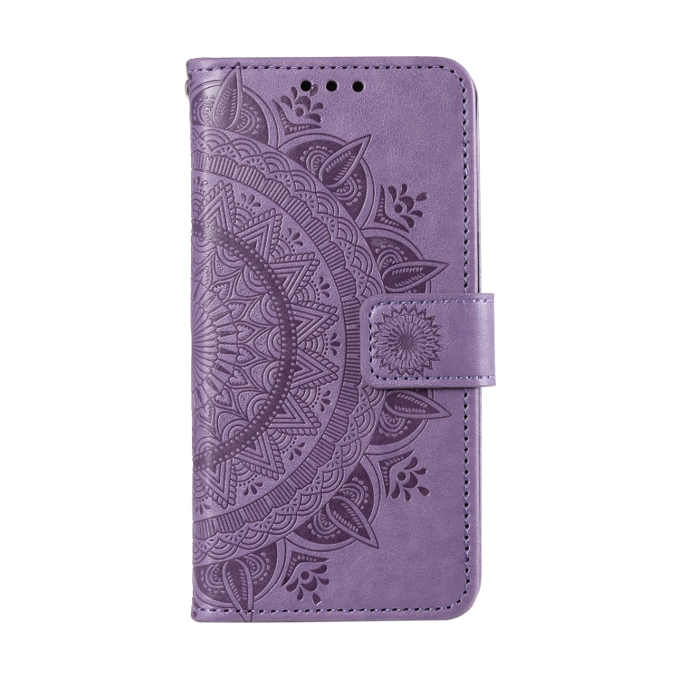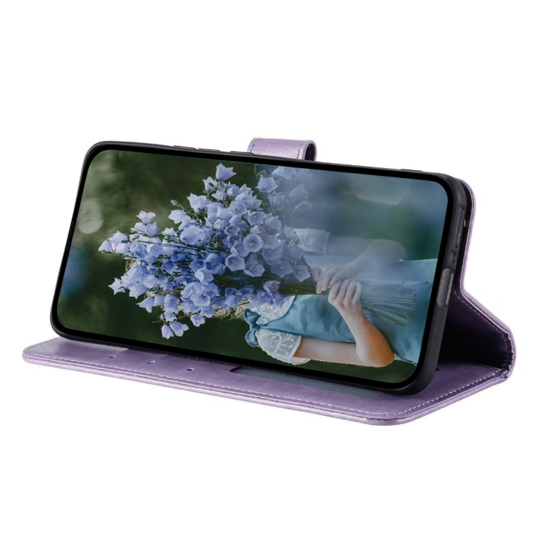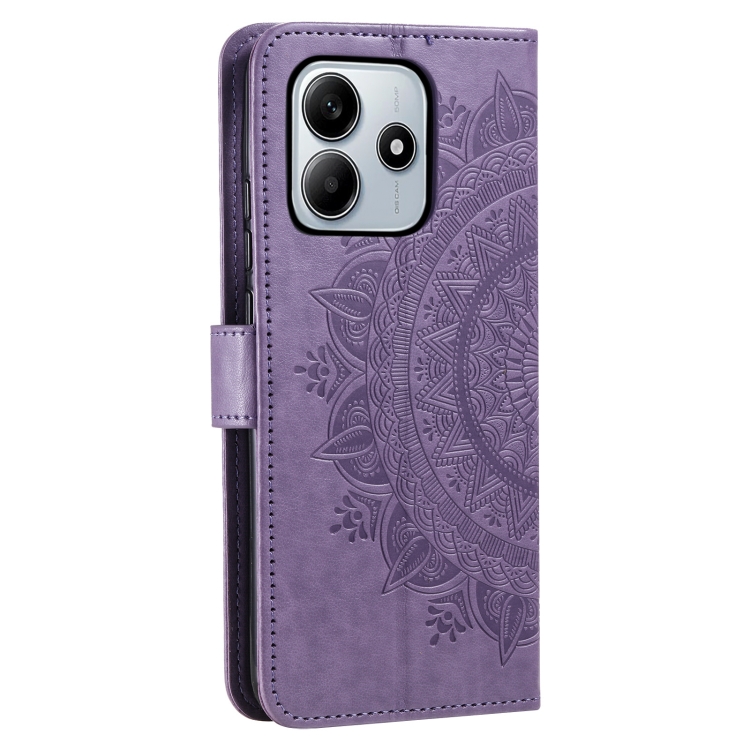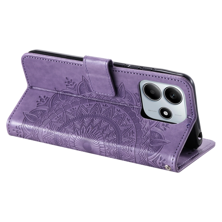Funda de Cuero con Relieve de Flores y Tótem para Xiaomi Redmi Note 14 5G con Cordón (Morado)