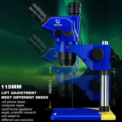 El Microscopio Estéreo Trinocular de Vídeo HD Super X con rotación mecánica de 360° es un equipo Óptico avanzado diseñado para profesionales y técnicos que requieren una observación detallada en reparaciones y análisis de precisión. Este microscopio trinocular incorpora un sistema Óptico Greenough con diseño en forma de V oblicuo hacia adentro, que proporciona imágenes nítidas y con alta profundidad de campo, superando las capacidades de microscopios estereoscópicos convencionales. Equipado con oculares gran angular estándar PL 10X/22MM, ofrece un amplio campo de visión plano que reduce la fatiga visual durante sesiones prolongadas. Su ajuste de elevación de 115 mm y su riel deslizante lineal permiten adaptar el enfoque y la posición para trabajos en Placas Base, Teléfonos Móviles, Computadoras, electrodomésticos y componentes de precisión. Además, cuenta con una interfaz reservada para Cámara industrial electrónica HD, facilitando la captura de fotografías y grabación de vídeo para documentación o análisis posterior. La rotación libre de 360° del cuerpo del microscopio optimiza el espacio de trabajo sin interferir en otras operaciones, siendo ideal para aplicaciones en reparación, montaje de Relojes, comprobación de circuitos y tareas científicas.
