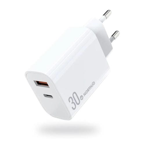 Cargador rápido de pared Northjo Nopd3002 con puerto dual USB-C PD 30 W y QC3.0 con enchufe europeo (Blanco)