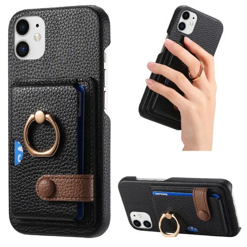 Funda para Teléfono iPhone 12 con Parte Posterior de Tarjeta y Anillo Borde de Aceite de Cuero Litchi (Negro)
