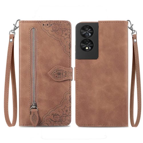 Funda de Cuero para TCL 40 Nxtpaper 4G con Cremallera y Flor En Relieve (Marrón)