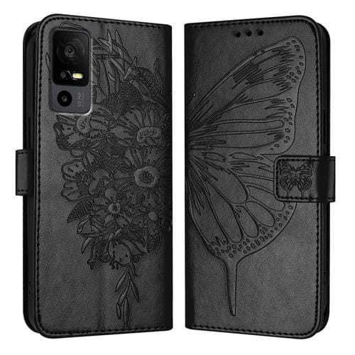 Funda de Cuero para TCL 40 R 5G con Mariposa en Relieve (Negro)