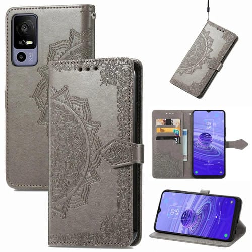 Funda de Cuero En Relieve para TCL 40R Mandala Flower (Gris)