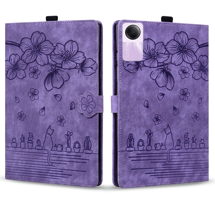 Para Xiaomi Redmi Pad Se Funda para Tableta de Cuero con Relieve de Gato Sakura de Dibujos Animados (Púrpura)